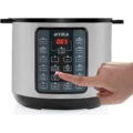 Basınç kontrolünü sağlayan basınç valfi Dayanıklı hazne Yapışmaz iç yüzey Tek tuşla pişirme Sağlam ve güvenli tasarım Kolay temizlik Max. 1000 W güç 6 L tencere kapasitesi 8 adet güvenlik koruması 17 farklı pişirme yöntemi 220-240 V, 50-60 Hz; 1000 W Tekrar ısıtma özelliği