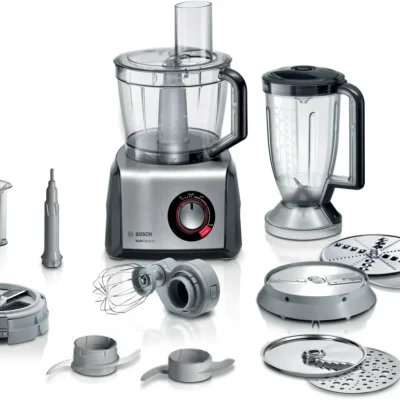 Birlikte verilen aksesuarlar: 1 x kapak, 1 x plastik yoğurma kancası, 1 x plastik karıştırma kabı, 1 x plastik blender aparatı, 1 x patates kızartması diski, 1 x Tersine çevrilebilir rendeleme diski kaba/ince, 1 x Kaba rendeleme diski, 1 x karıştırma çırpma teli , 1 x disk desteği, 1 x Tersine çevrilebilir dilimleme diski kalın/ince, 1 x doldurma, 1 x üniversal bıçak, 1 x kare kesici, 1 x Asya sebze diski, 1 x küp kesici uç 9 mm